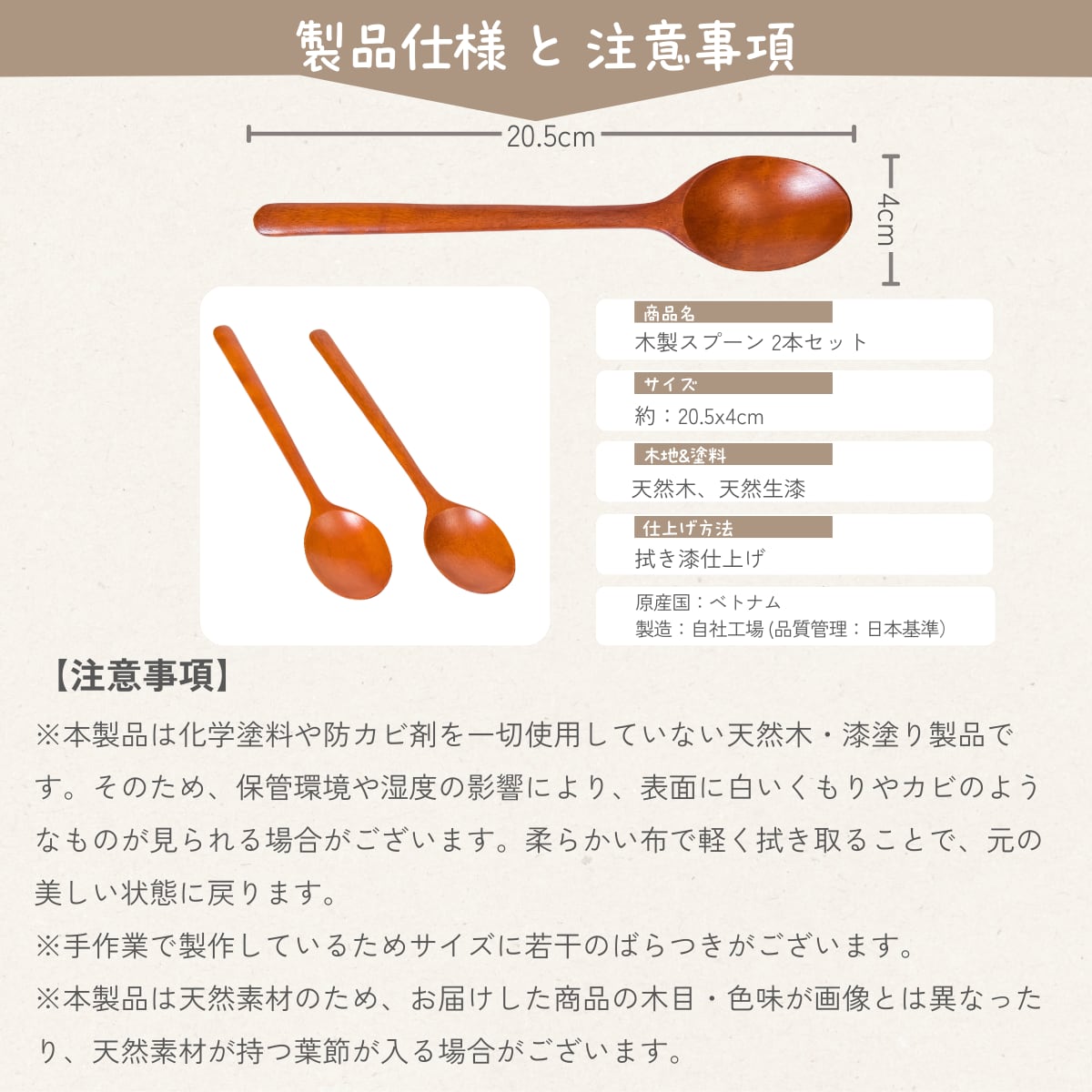 [徳成] 木のスプーン 木製漆塗りスープスプーン 軽量 20.5cm 丸め型 2本セット TAA-202 [食品衛生法適合品]