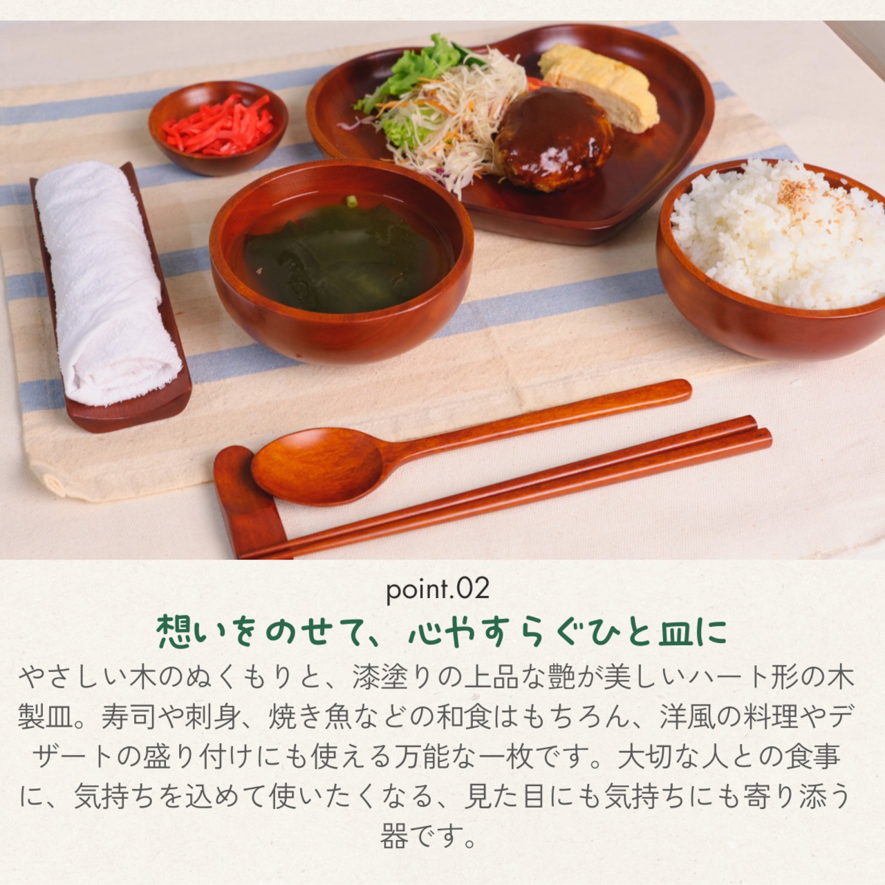 【 天然木製 & 漆塗り仕上げ 】厳選された天然木を使用し、職人の手仕事による漆塗りを施しました。なめらかな手触りと、漆の艶が上品な光沢を生み出し、料理を美しく引き立てる木製プレートです。