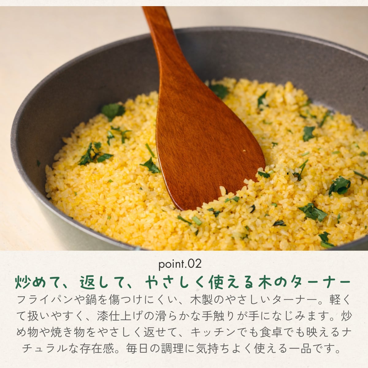 【 フライパンを傷つけない丸みのある先端デザイン 】先端7cmの丸みのある形状が特徴で、食材を優しくすくい、崩さずきれいに返すことができます。特に、ハンバーグやオムレツ、チャーハン、クレープなどの料理に最適です。