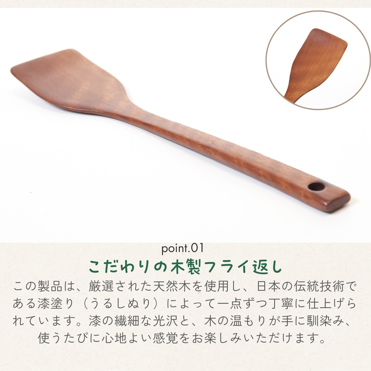 「料理がもっと楽しくなる、漆塗りのミニターナー」 天然木と漆塗りの美しい仕上がりが、キッチンに温かみと上品さを加える「木製漆塗り フライ返し ターナー 小さめサイズ」。炒める・返す・すくうがこの一本でスムーズにこなせる便利な形状で、毎日の料理を快適にサポートします。ぜひ、この機会にお試しください。