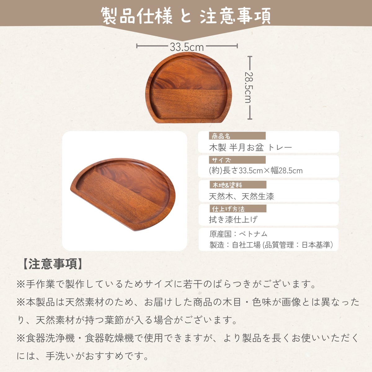 漆仕上げ 木製半月盆 トレー 33.5x28.5cm