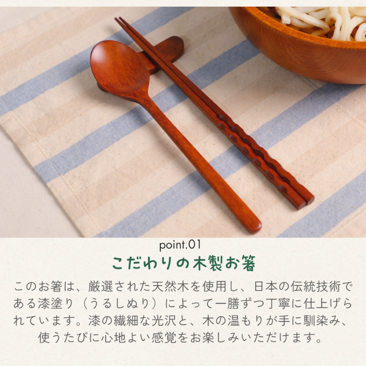 「木の優しさを感じる、漆塗りのお箸」 天然木と漆塗りの美しい仕上がりが、食卓に温もりを添える「木製漆塗り お箸」。軽くて持ちやすく、食事の時間をより快適にします。ぜひ、この機会にお試しください。