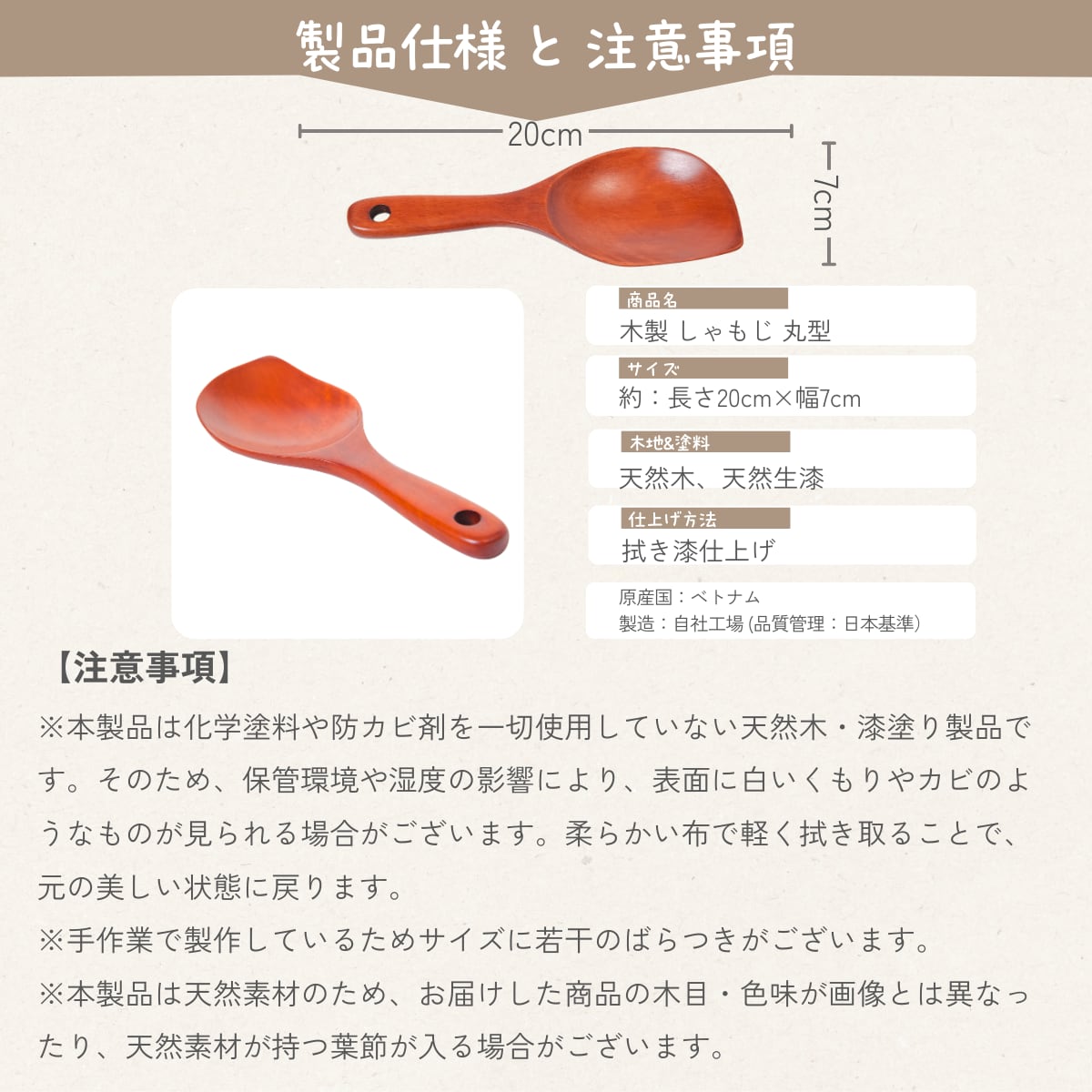 【 ご飯がつきにくい、やさしい工夫 】天然木のしゃもじは、水にくぐらせてから使うことで、ご飯のべたつきを抑えやすくなります。毎日の食卓に、自然素材の心地よさをお楽しみいただけます。