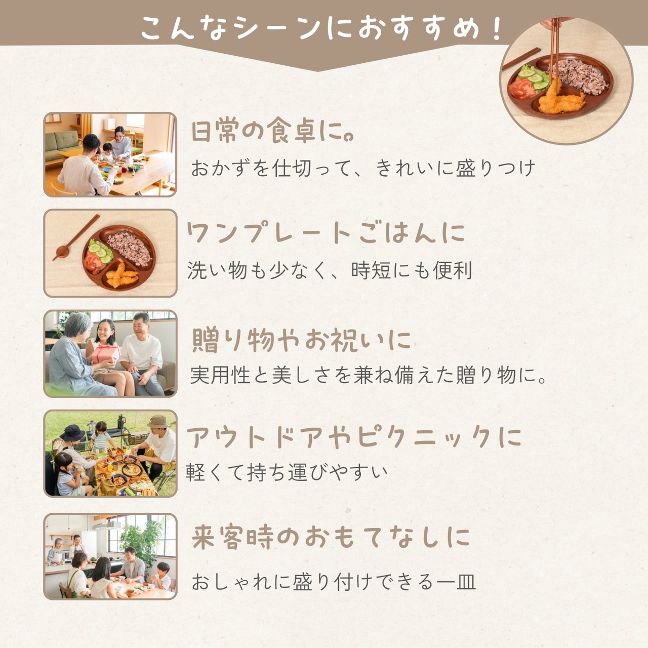 「食事の時間をより快適に、木製ランチプレートで上質な食卓を」 天然木と漆塗りの美しい仕上がりが、料理をより美しく引き立てる「木製漆塗り ランチプレート」。軽くて割れにくく、温もりのある木製プレートは、家庭用から業務用まで幅広く活躍します。ぜひ、この機会にお試しください。