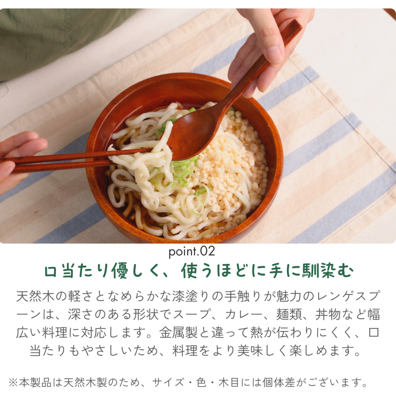 【 熱くなりにくく、口当たりが優しい 】木製のため、金属製スプーンのように熱くなりにくく、スープや温かい料理を快適に楽しめます。口当たりがなめらかで、唇に優しくフィット。