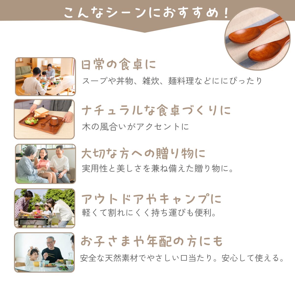 【 熱くなりにくく、口当たりが優しい 】木製のため、金属製スプーンのように熱くなりにくく、スープや温かい料理を快適に楽しめます。口当たりがなめらかで、唇に優しくフィット。