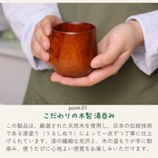 「上質なひとときを、木製湯呑みで楽しむ」 天然木と漆塗りの美しい仕上がりが、飲み物の美味しさを引き立てる「木製漆塗りコップ 湯呑み」。ティーカップや木製コップとして、温かい飲み物も冷たい飲み物も、最後の一口まで心地よく味わえます。ぜひ、この機会にお試しください。