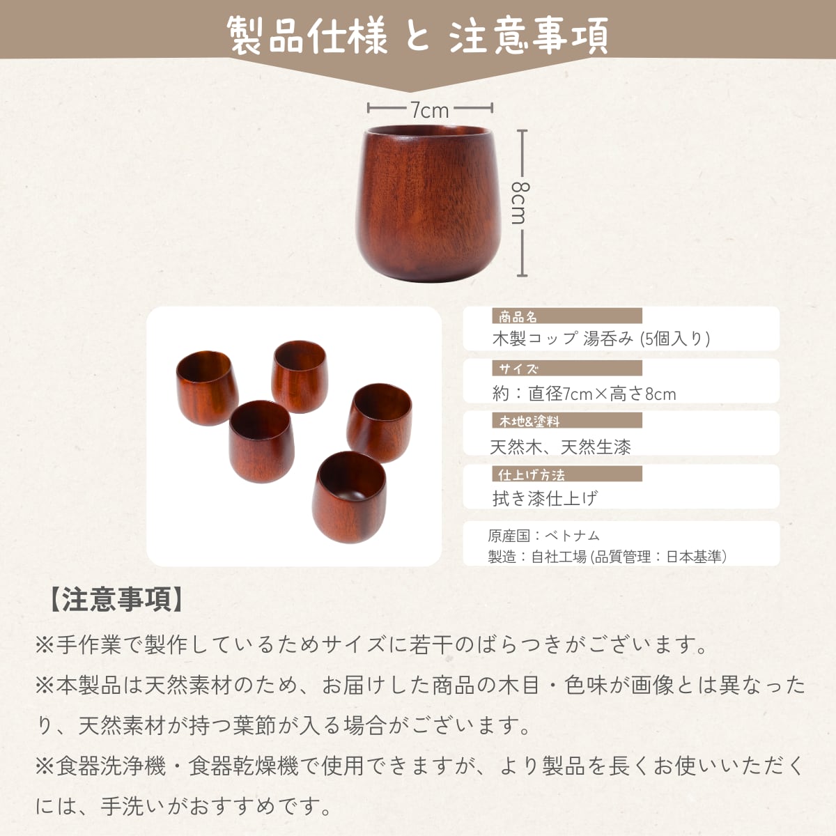 [徳成] 湯呑み コップ (木製漆塗り/直径7×高8cm) 5個セット|まとめ買いで日常からおもてなしまで TAW-502 [食品衛生法適合品]